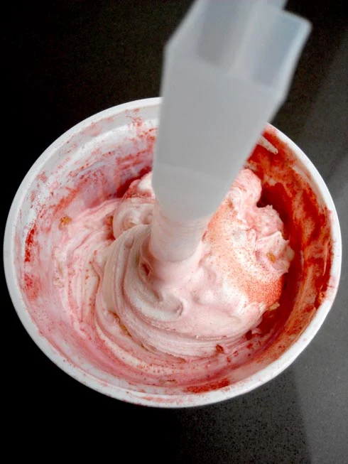 Anyway, the red velvet flavour was quite a gem. Just look at that lovely scarlet colour! I was glad that not all the powder in mine had been dissolved, because I loved the effect produced with the striking red powder swirled into the white cream.